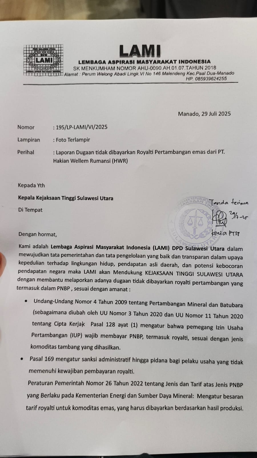 “Surat laporan kami tertangal 29 Juli 2025 tentang dugaan PT HWR tidak membayar royalty pertambangan sudah di meja Kejati Sulut. Kami yakin Kejati segera merespon laporan kami dan mengambil tindakan yang diperlukan,” kata Ketua LAMI Sulut, Indri Montolalu.